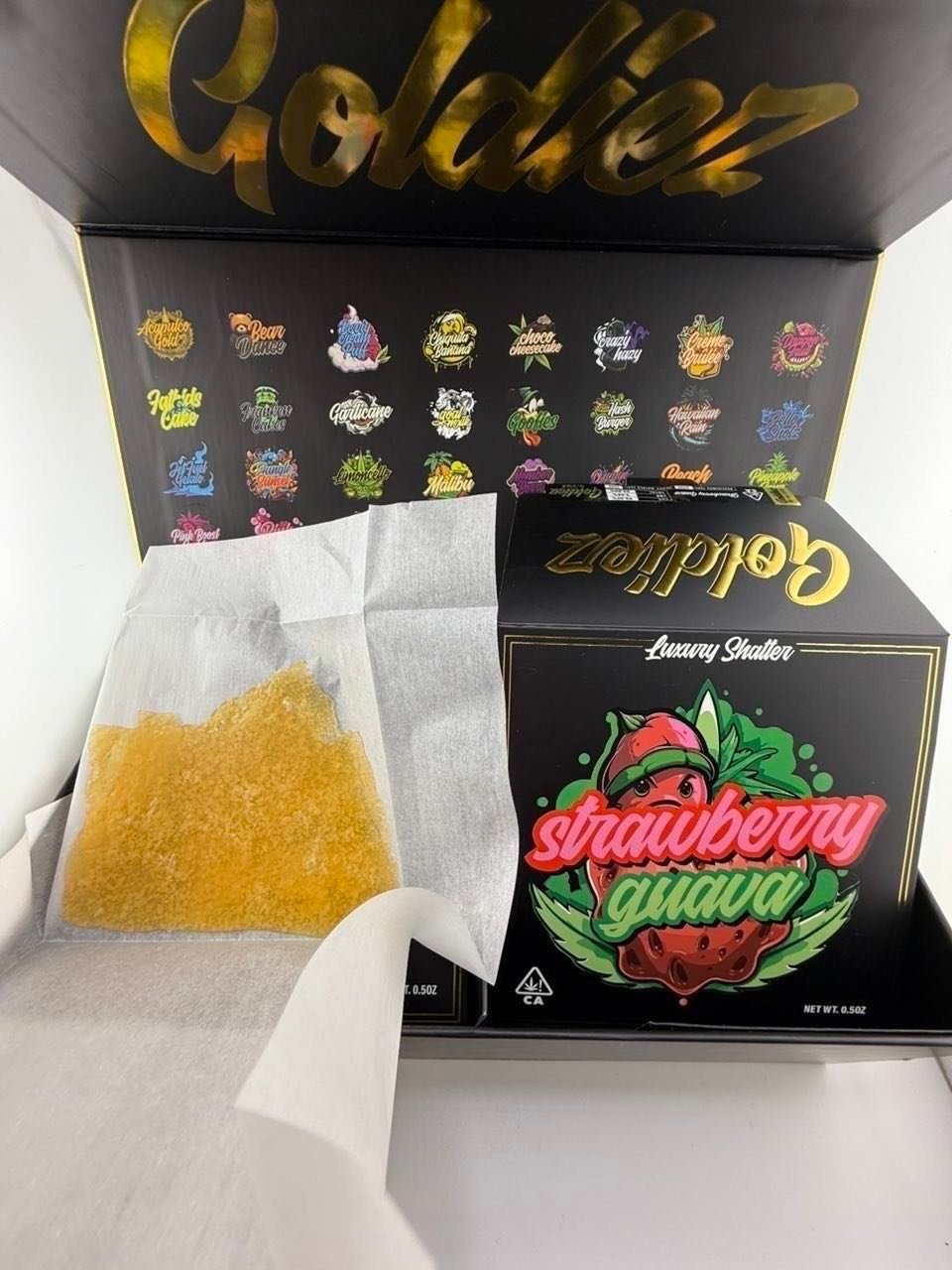 Goldiez Assorted Luxury Shatter is available through select licensed dispensaries and verified online retailers.
